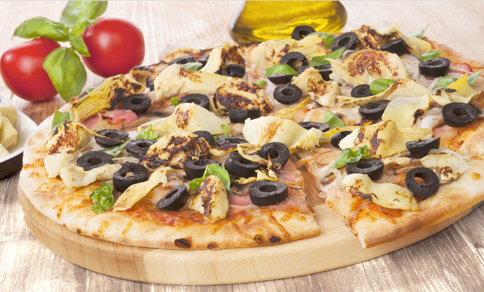 Extra-virgin olive oil, garlic, mozzarella cheese, onions, mushrooms, green olives, black olives, fresh tomatoes.